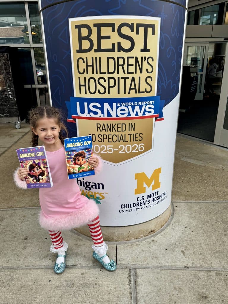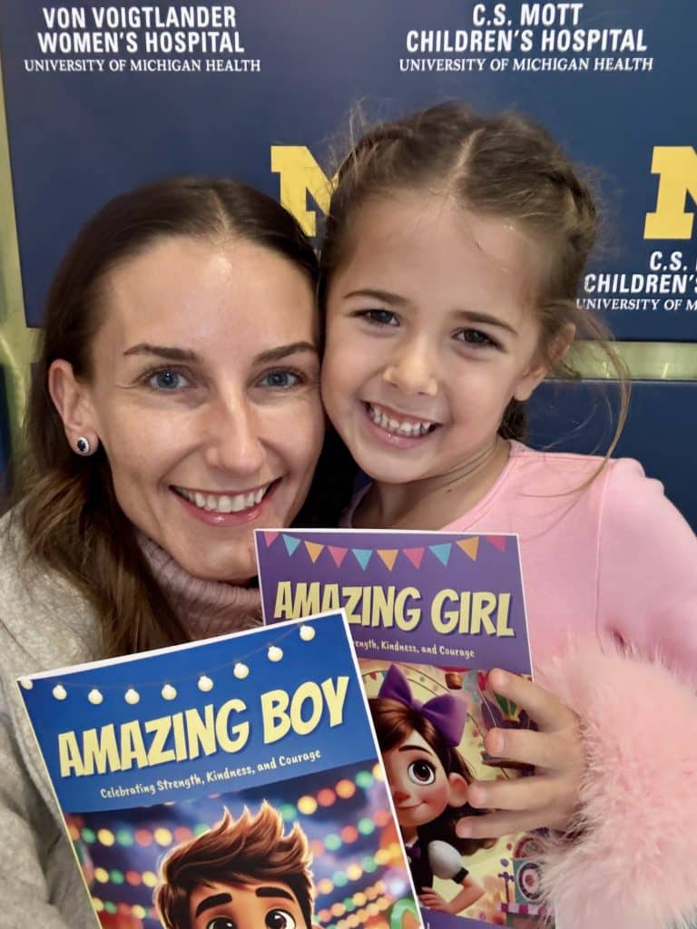 This Christmas season, Dr. Katherine Lewitzke and her five-year-old daughter, Vera, shared a very special act of kindness—donating a large collection of Amazing Boy and Amazing Girl books to children staying at C.S. Mott Children’s Hospital.